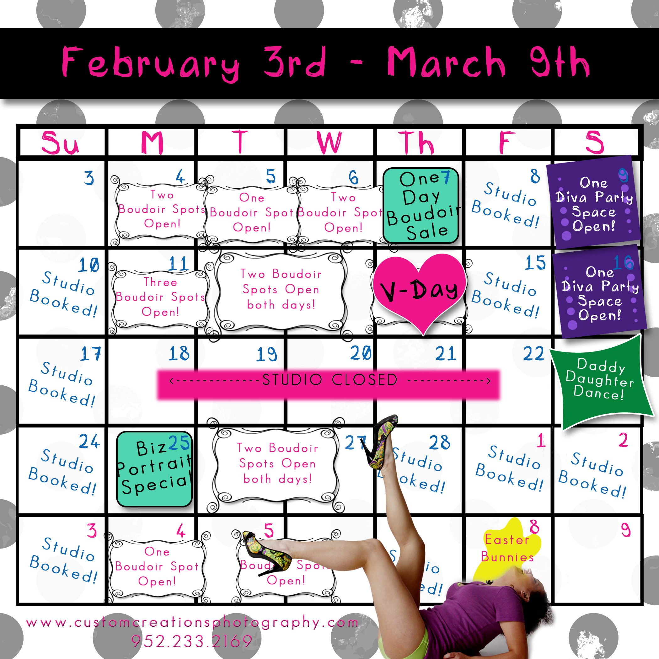 As you can see, we have a crazy busy month ahead of us, so be sure to call and get your sessions booked early!!! We will be running a One-Day Boudoir Sale on Feb. 7th and a Business Portrait Special on Feb. 25th, so watch for details!! We can’t wait to see you at our new studio space soon!!!